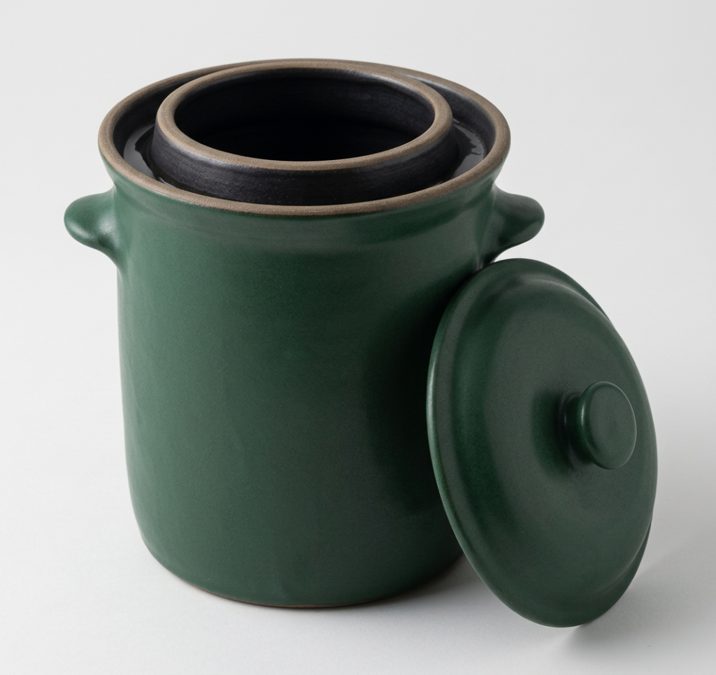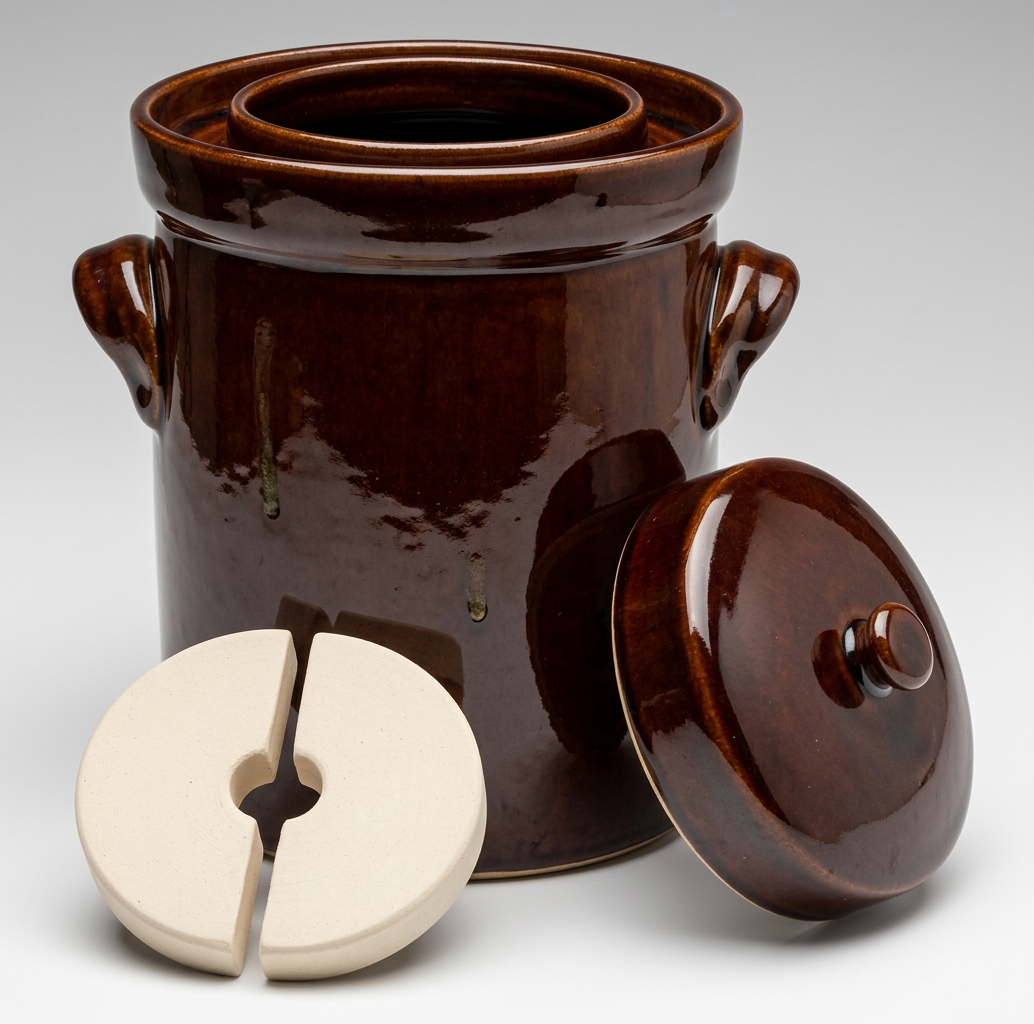 Cuando descubrí este elemento comprendí lo importante que era para los alemanes hacer mucha verdura fermentada. Si quieres tener sauerkraut disponible para todo el año, no puedes funcionar con botes de conservas (aunque sean de dos litros). Esta olla de fermentación (Gärtopf la llaman los alemanes) es el dispositivo perfecto para fermentar grandes cantidades y que no se estropee la verdura. Como en España es muy difícil encontrarla, la pedí a Amazón.de (Alemania). Están hechas de gres cocido a 1260 grados centígrados y son especiales porque se han fabricado sin plomo, puesto que este metal resultaría venenoso para usos culinarios. La que yo compré tiene una capacidad de 7 litros, lo que permite meter 4 repollos medianos un poco justos. Hay otras capacidades. Puedes verla en este enlace.