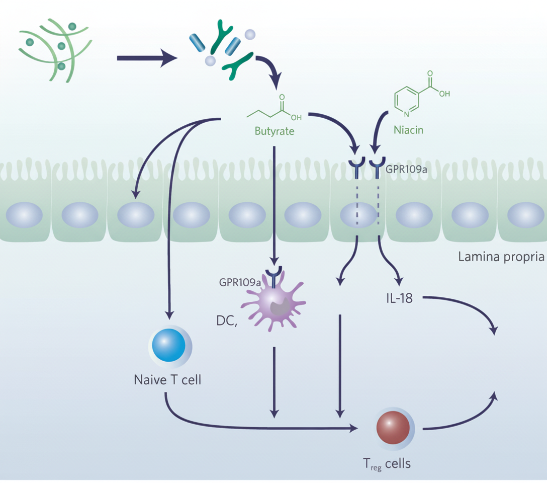 El butirato ha sido estudiado por su papel en la nutrición de la mucosa del colon y en la prevención de cáncer de colon, mediante la promoción de la diferenciación celular, la detención del ciclo celular y la apoptosis de los colonocitos modificados; la inhibición de la enzima histona desacetilasa y la disminución de la transformación de los ácidos biliares primarios a secundarios como resultado de la acidificación del colon.